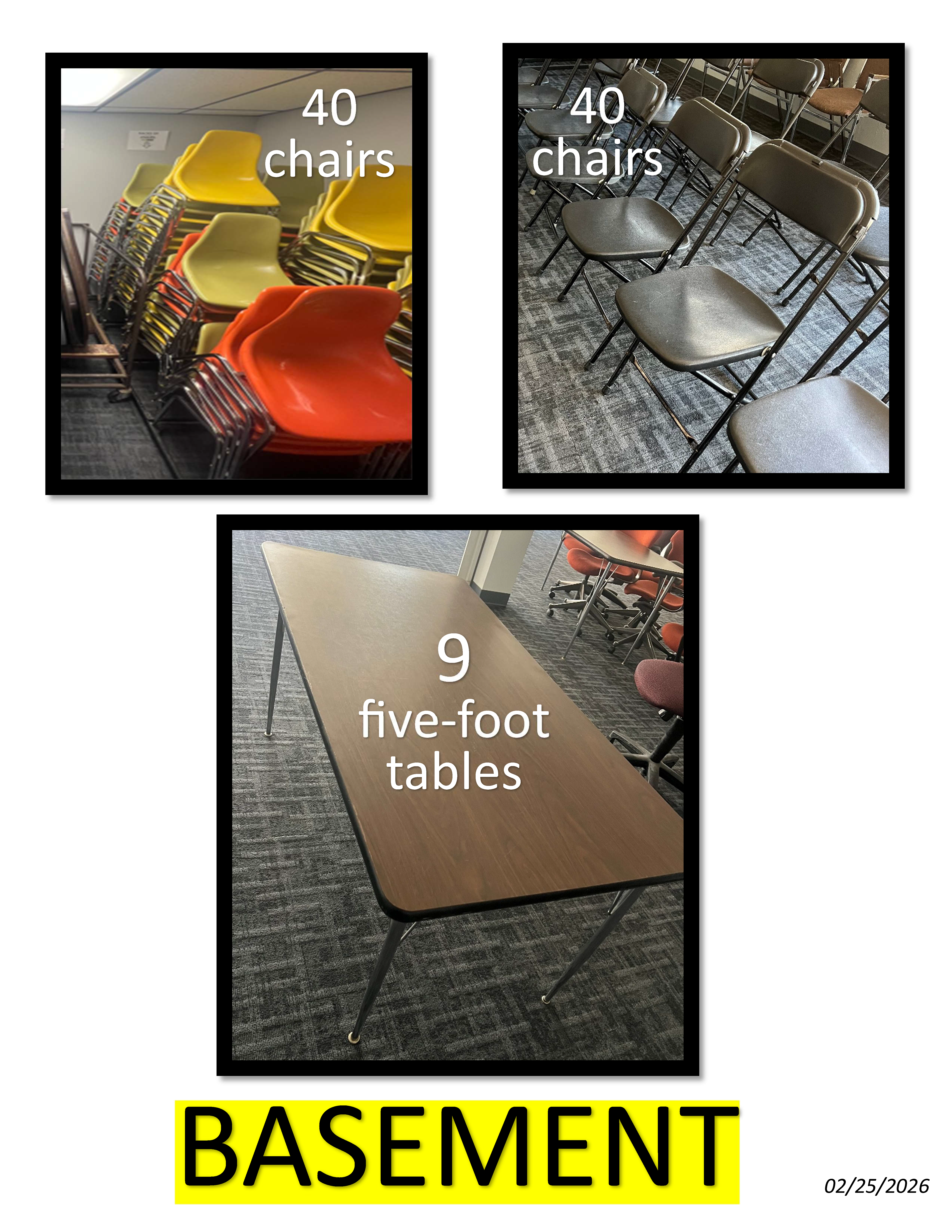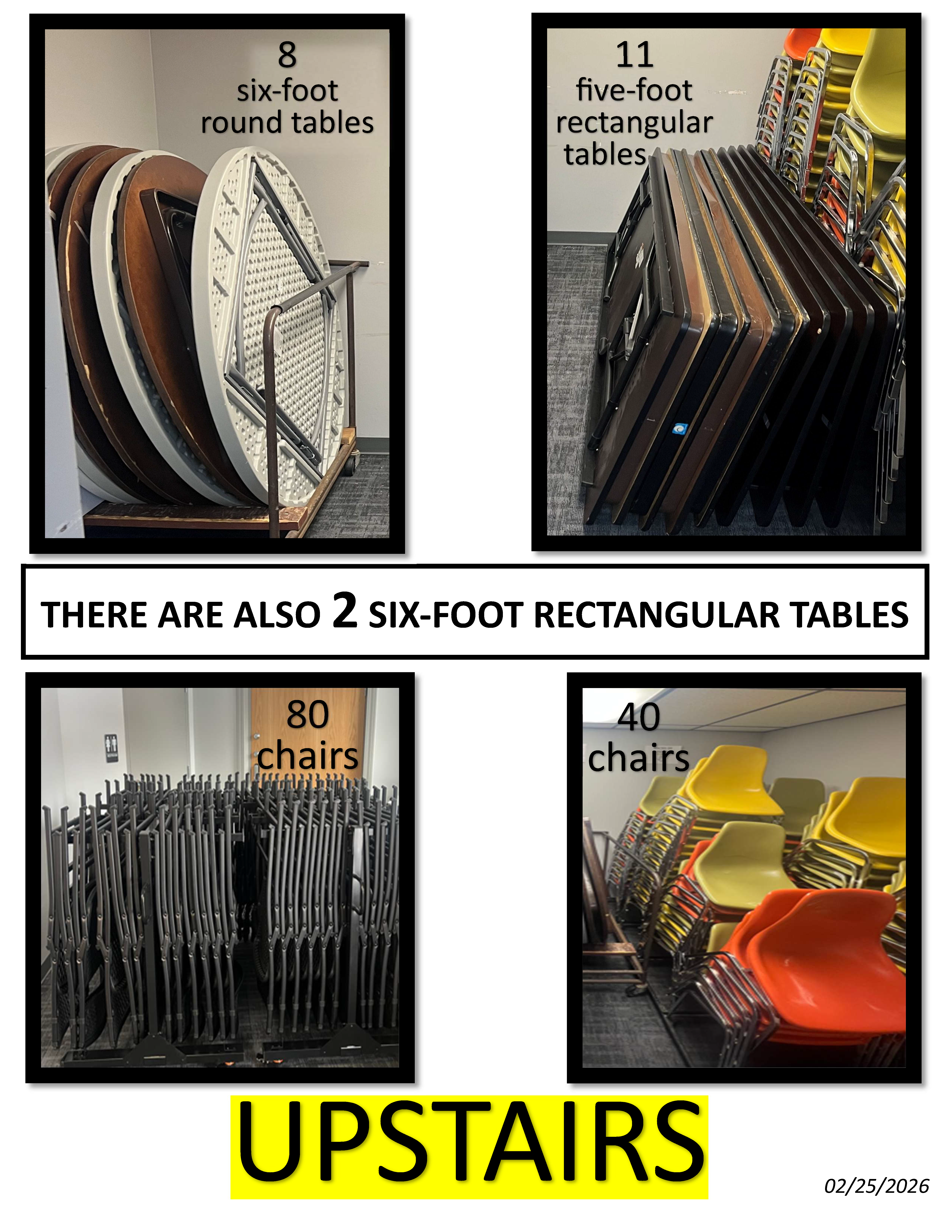 There are 80 folding chairs, 40 Plastic chairs, 8 - 6' Round Tables, 11 - 8' Long Tables