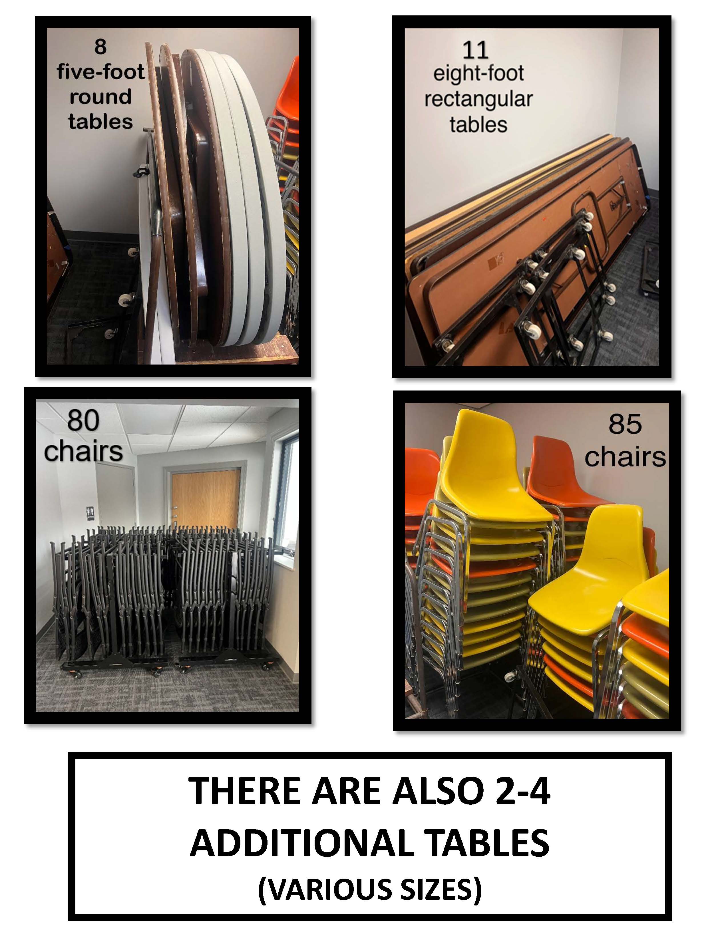 There are 80 folding chairs, 85 Plastic chairs, 8 - 6' Round Tables, 9 - 8' Long Tables